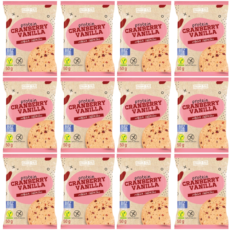 Zestaw składa się z 12 opakowań miękkich ciastek FRANK&OIL KETO o smaku żurawina&wanilia