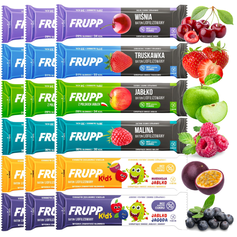 Owoce podane w formie pysznego, chrupiącego batonika, są zdrową alternatywą dla niskowartościowych i wysokokalorycznych słodyczy dostępnych obecnie na rynku. Do produkcji batoników Frupp nie używa się żelatyny jako środka zagęszczającego jak w wielu powszechnie dostępnych produktach, stosuje się natomiast naturalną pektynę owocową.
