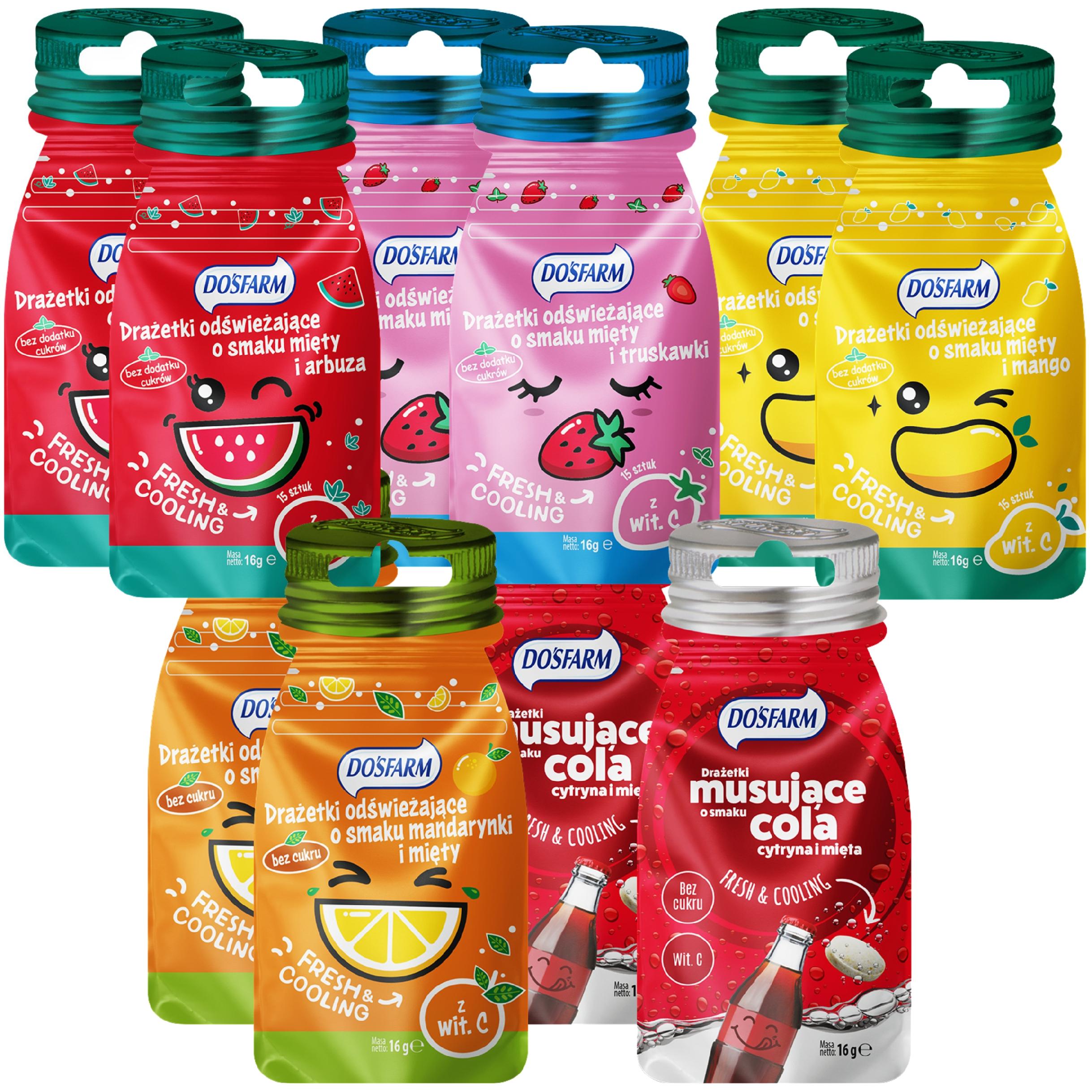 Drażetki odświeżające Dosfram w trzech smakach. Pastylki są bez dodatku cukru, do ich wytworzenia użyto sorbitolu. Spożycie sorbitolu nie powoduje zwiększania insuliny, dlatego jest polecany osobom chorującym na cukrzycę. 100 g drażetek zawiera aż 80 mg witaminy C (100% RWS – dzienna referencyjna wartość spożycia witamin i składników mineralnych (dla osoby dorosłej)). Drażetki są w opakowaniach w kształcie buteleczek, zamykane strunowo, dzięki czemu zapewniają długą świeżość produktu.