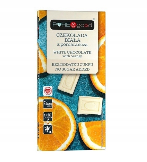 Czekolada biała z pomarańczą liofilizowaną bez dodatku cukru słodzona maltitolem (naturalną substancją słodzącą, brak tu dodanego cukru). Czekolady Pure&Good nie zawierają oleju palmowego, są bez E476, bez sztucznych słodzików. Czekolada jest bez glutenu. Brak dodanego cukru sprawia, że czekolada może być spożywana przez cukrzyków, diabetyków oraz osoby na diecie odchudzającej.