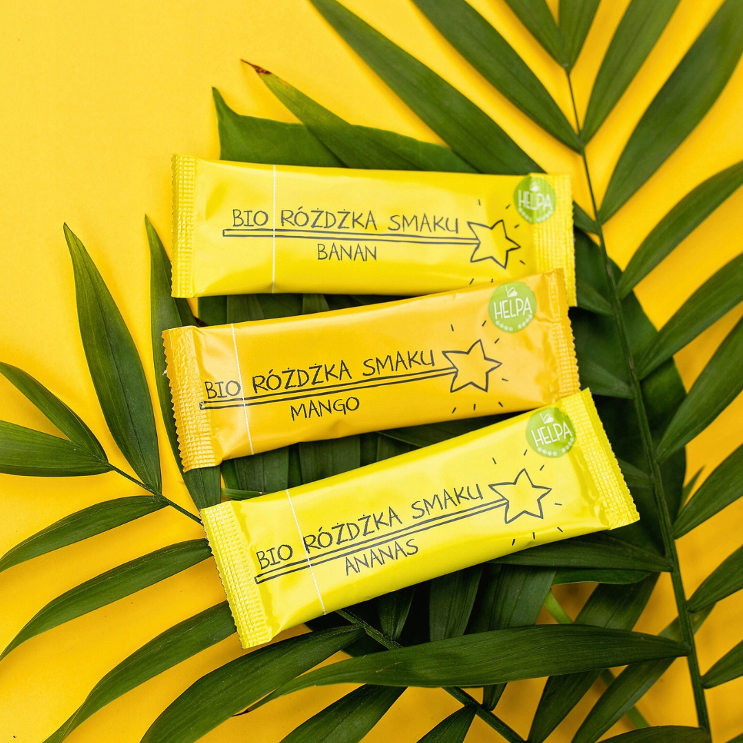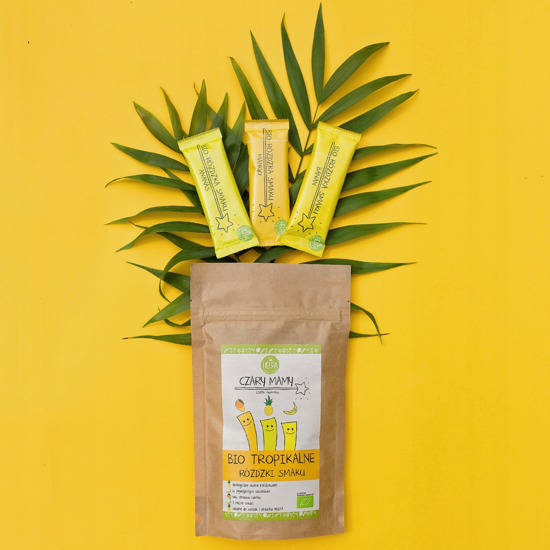 BIO TROPIKALNE Różdżki Smaku to zestaw 3 różnych owoców tropikalnych o wyjątkowych smakach, zamkniętych w kolorowych saszetkach. W skład zestawu wchodzą po trzy 2 gramowe opakowania ananasa, banana i mango – łącznie 9 Różdżek Smaku!