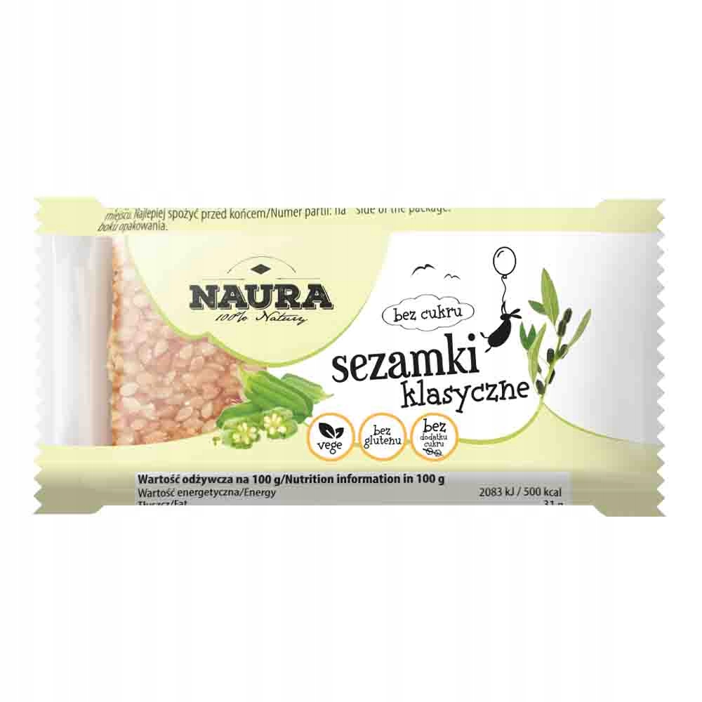 Sezamki bez cukru Naura to smaczna, a jednocześnie wyjątkowo zdrowa przekąska. Dzięki użyciu syropu maltitolowego zamiast cukru mogą być spożywane przez diabetyków i osoby dbające o smukłą sylwetkę. Sezamki są w 100% wegańskie, bez dodatku cukru i laktozy. Powstają na bazie wyłącznie najlepszych, naturalnych składników. Wszystko to sprawia, że sezamki są najlepszą przekąską w czasie podróży, podczas wysiłku fizycznego oraz w każdym momencie, kiedy potrzebujesz zastrzyku pozytywnej energii.